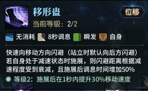 移形蛊,基础的闪避技能。对于这个技能,我的建议是使用SHIFT闪避,在 设置——游戏设置——偏好 中将双击方向键闪避的勾点掉,不然很容易出现误闪避的情况。