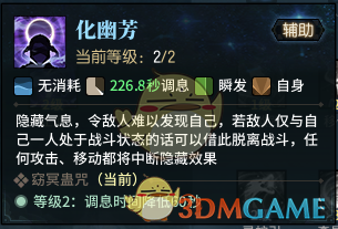 化幽芳,脱战技能。平常不管是野外还是副本,拿来脱战都很好用。而且在副本群怪的时候,如果T是个急性子,一波没搞完又想直接去搞下一波的时候,我们可以用这个技能脱战再进隐身,这样我们就可以以非战斗状态的隐身进入下一波战斗,美的很。
