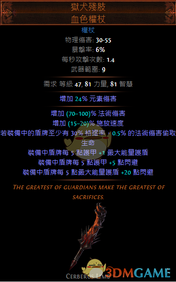 后缀方面没什么好说的,自然是抗性抗性抗性,或者可以牺牲一条抗性词缀选择格挡率8%的词缀,这样同时能利用起武器上的法术伤害吸血,如果BD不是靠秒回而是吸血(点灵能护体)的话可以选这个。