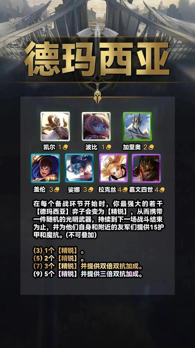 你最强大的1/2/3/5个德玛西亚英雄会在每个回合获得一件随机光明装备,并且会为邻近的友军提供5/25/80/200双抗,但不会叠加。