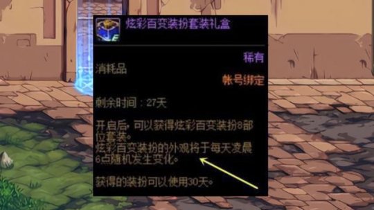 百变炫彩时装,基础属性是“高级时装8部位”,穿上后,每天早晨6:00,装扮外观就会随机发生变化,一共有8种外观,所以,所谓百变是噱头,实际上是“八变时装”。
