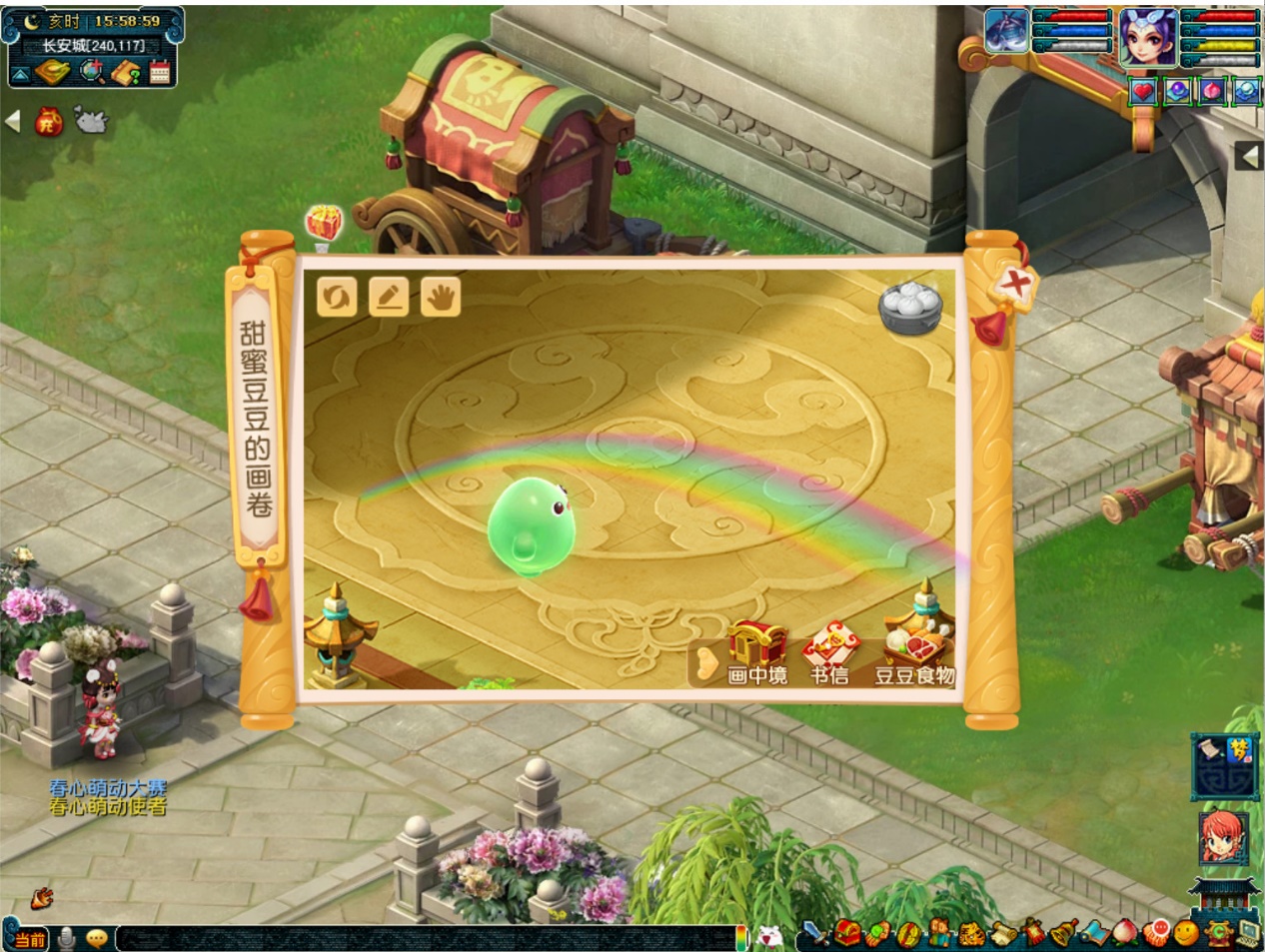 甜蜜豆豆的画卷中有着一弯美丽的彩虹桥,当玩家点亮全部的彩虹桥后,甜蜜豆豆将会化身成为玩家的祥瑞。活动期间,每完成20次环任务即可点亮一格彩虹桥。每日最多可以点亮7格彩虹桥。