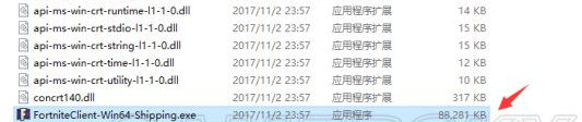 1.在你的电脑中找(你游戏安装的位置/ Fortnite / FortniteGame / Binaries / Win64)。找到一个名字为FortniteClient-Win64-Shipping.exe的应用程序