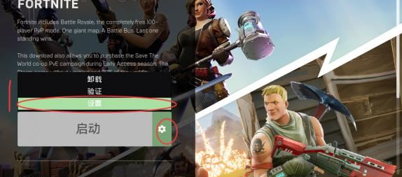 5.打开游戏客户端Epic Games Launcher选中Fortnite后,点击启动按钮右边那个齿轮一样的图标,然后选择设置。