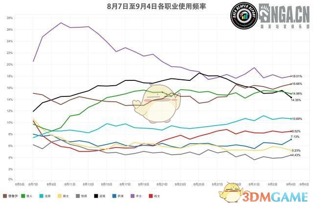 术士仍然是5级以下分段最热门的职业。而在4级以上,德鲁伊则成为了出场最多的职业。德鲁伊可谓一手促成了奇数贼的陨落,因为奇数贼在对阵大多数德鲁伊形态时都是劣势。上周的环境终结者超生德的热度继续攀升,如今在除了传说分段之外的全天梯都超过了蓝龙德,并且到下周很有可能在传说分段也实现超越。如今如果你在天梯对上德鲁伊,在选牌阶段不妨优先按照超生德来准备,因为这个卡组不仅强力,而且他的构筑仍在继续演化。