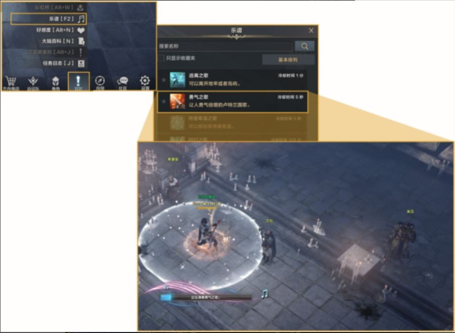 对话完成后走到前面亮起白光的地板演奏歌曲。(使用 F2 键调出乐谱,鼠标左键点击歌曲后再点击下方演奏按钮)