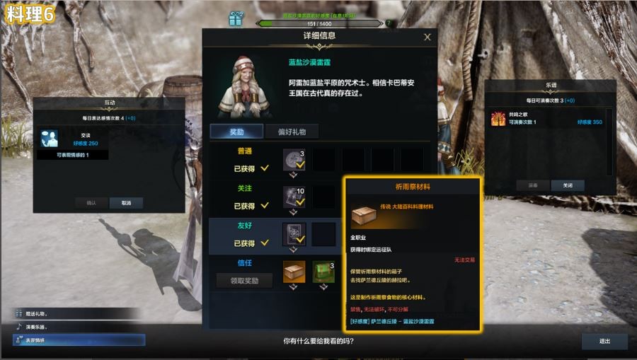 分为直接获取和获取原材料再去制作两种方式。部分特别的料理与NPC好感度挂钩。