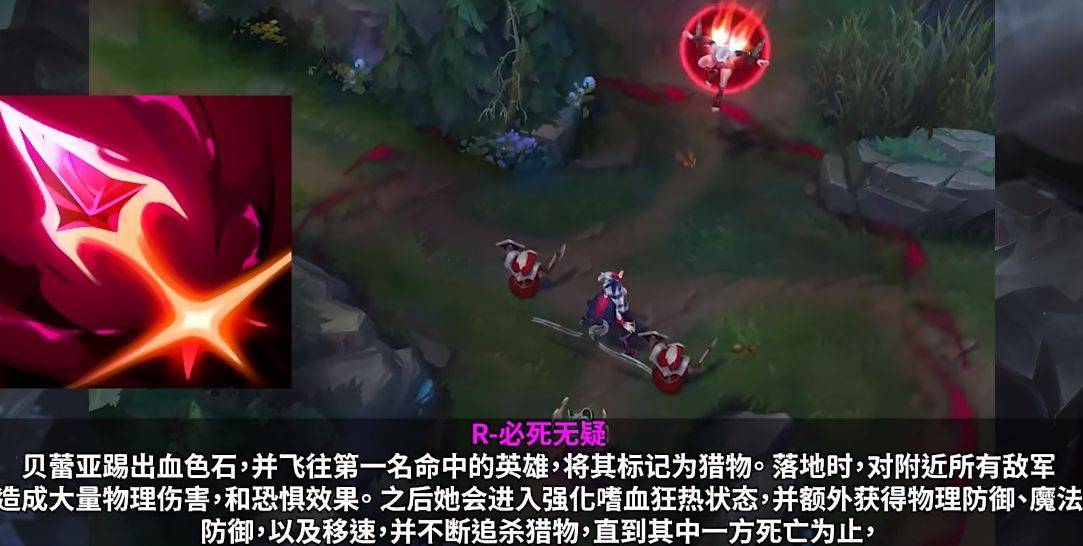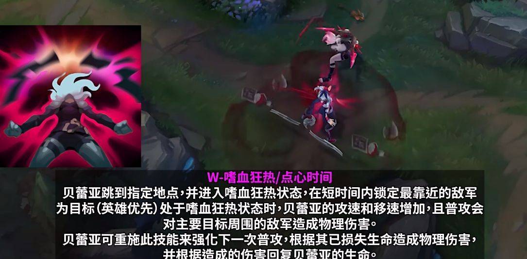 贝蕾亚跳跃至目标位置并进入鲜血狂乱状态,在一段时间内嘲讽最近的敌人(优先英雄)并获得攻击和移动速度加成,她的攻击会对主要目标周围造成物理伤害(AOE);
