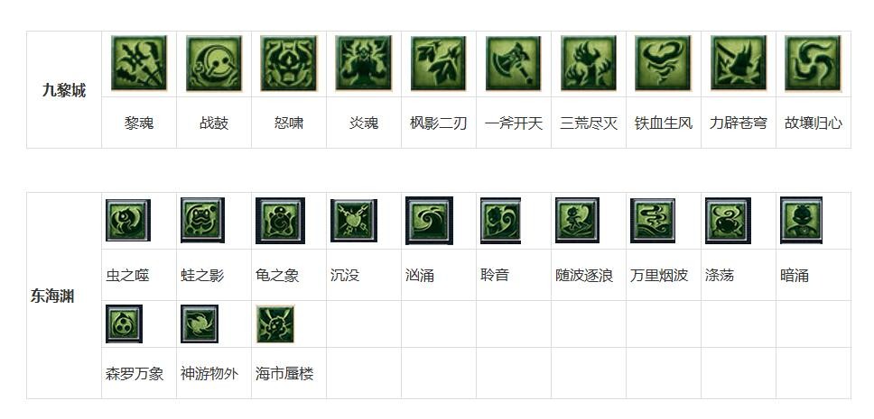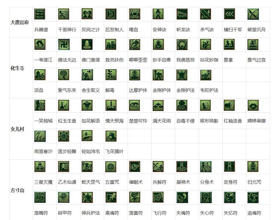 门派技能(暗绿色)(新门派放在前面供大家提前预习与集中查找):