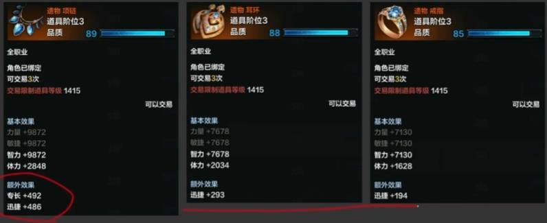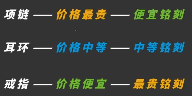 接下来是饰品的选择,三个部位分别是一条项链两个耳环,两个戒指,由于项链拥有两个额外效果,所以价格在三个部位中是最贵的,耳环和戒指都是一个额外效果,耳环数值高价格中等,戒指数值低所以最便宜,所以在购买饰品的时候,就要知道如何花小钱办大事,刚才我已经说了项链是三者中最贵的,所以在购买的时候呢,就选择最便宜的铭刻组合,而价格最便宜的戒指呢,则选择贵的铭刻,耳环自然是中间了,如果你还是没明白我再举个例子,左边的项链是诗人的职业,铭刻,迫切救赎3、妙手回春5,这样的铭刻组合价格是非常吓人的,而右边品质更高的项链,铭刻是压制5身披重甲3,这样的铭刻组合价格就很便宜了。