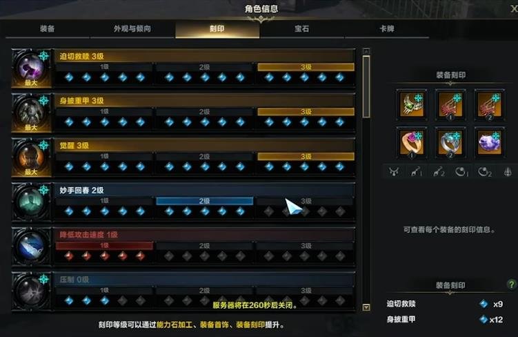掌握了以上的省钱规律,就可以开始正式搭配铭刻了,我们先来看左边这个红字需求铭刻,这里,可以选择你需要搭配的5条铭刻,这里呢我已经选好了,以吟游诗人为例啊,迫切救赎、觉醒、妙手回春、身披重甲,基本这四三是不动的,然后压制的话呢,你可以看情况换成以态生成,或者法力充盈等等都可以,右边呢是项链两个耳环两个戒指,一个能力石,额外附魔呢是我们身上所带的铭刻,然后这边呢是简易的铭刻,就是负面的效果。