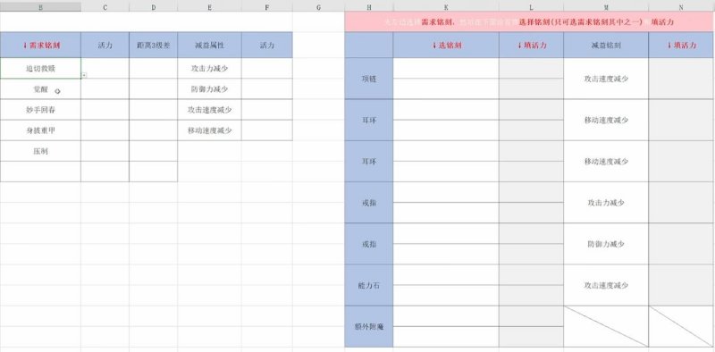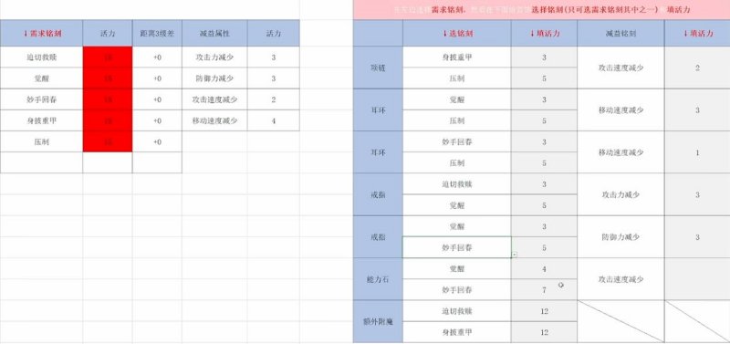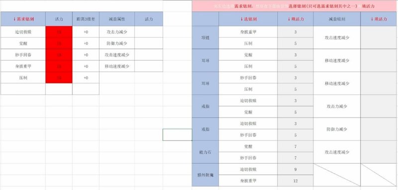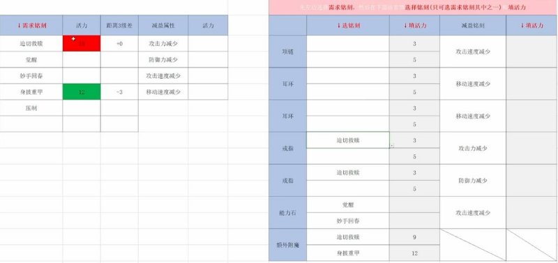 现在呢,我就开始教大家怎么去用这个表,首先来看我们身上携带的铭刻,由于能力石上面是没有职业名刻的,所以身上呢,携带的其中一条就是我们的职业铭刻,那么另外一个呢从通用的角度来说,我会偏向于选择身披重甲,因为如果说你在一个账号里面,你有辅助角色还有输出角色的话呢,身披重甲是相对通用的一个铭刻,这里呢我推荐吃金书的话呢是12对吧,然后你的职业出于考虑的话呢,只吃紫书,这里就输入9,那么从左边看到啊,我们的职业铭刻是9点,有一个黄色的一个格子,身披重甲呢有一个绿色的格子显示12点,然后就是能力石,从四三铭刻来选择的话呢,剩下的两条就是觉醒和妙数回春,剩下一个压制是最便宜的,所以呢更多的思路呢,是在这5个饰品里面去搭配压制,那么接下来先去输入5和3两组数字,因为所有的视频都是53的词条,那么我们就输入5和3,我之前已经说了戒指是最便宜的饰品,所以呢它搭配最贵的铭刻,那么我们身上所携带的职业铭刻,迫切救赎呢,你要到15点的话呢就等于是9+3+3对吧,那么所以呢戒指的这两条3的话呢,就去选择迫切救赎,那这样的话呢,左边显示这个红色的 15点,已经是一条完整的迫切救赎铭刻了。