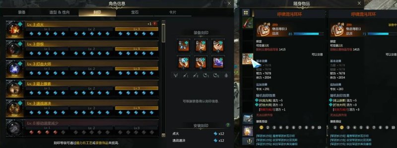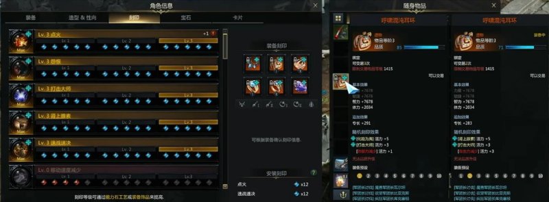 接下来呢是进阶版的搭配,比如说我这里第二条呢铭刻,攻击要害就是国服的压制,是增加瘫痪值的对吧,如果说我们在游戏的后期,遇到一些副本是不需要去打瘫痪的,那么就可以换另外一条便宜的铭刻,比方说以太生成那这里要怎么去换呢,首先我们来看这个戒指,我现在身上戴的戒指呢,就是在右边这个装备中是吧,是5点的迫切救赎和3点的压制,准备要换上去的这个戒指呢,我买了一个相同的,就是5点的迫切救赎,但是呢压制的3点呢,换成了以太生成的3点,那么我把它换上去以后呢,哎就可以看到,压制呢就少了三点对吧,然后呢就多了三点这个以太生成好了,然后呢在人物的这个面板当中啊,把这个压制呢给他换成以太生成,那么这个时候呢就可以看见第二条呢,铭刻呢就完全从压制变成了以太生成,那这样的话呢,就让我们可以更方便的去,应对不同的副本需求。