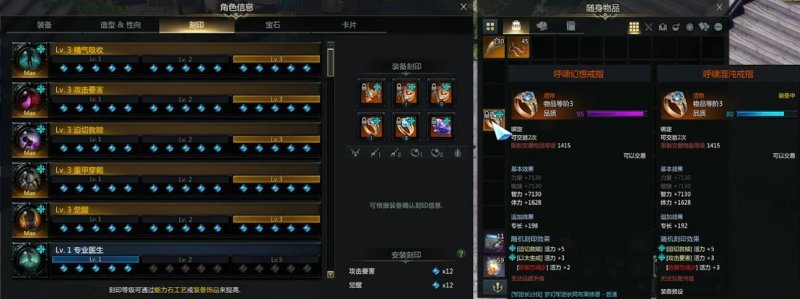 接着来配最便宜的铭刻,那么压制或者以太生成或者法力充盈,是5条铭刻当中最便宜的一条,所以呢在剩下的项链和两个耳环当中,必定这个5就出现3个压制,那么这里呢我就把压制给它配上去,对吧 5+5+5就是15点,那么可以看到,压制这15点已经配出来了,接下来把我们身上的身披重甲给它补全,因为是吃了金书的关系,原来是12点对吧,那就等于是12+3=15,那么呢就不可能在这个5点里面,去选择身披重甲的,必定呢要在这三点里面去选择,要么是两个耳环,要么呢是项链,那么身披重甲呢,相对来说啊,比压制和妙手回春要便宜一点点,那么所以呢,我会在项链里面去选择身披重甲,OK那么可以看到,在左边身披重甲也完成了搭配了,那么剩下这里有四个格子,我呢就把它均分,就比如说耳环这里是3,然后呢先带一个觉醒,另外一个3呢就带一个妙手回春,那么这里戒指呢,这个5呢就带一个觉醒,然后呢,另外一个5呢就带一个妙手回春,好了那么可以看到了,觉醒和妙手回春,在左边这里都显示是8点,那么意思呢,就是如果说你要配满15点的话呢,你的石头最低要配出七七,那么这样的话呢,一条完整的53铭刻就给他配出来了。