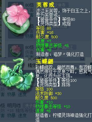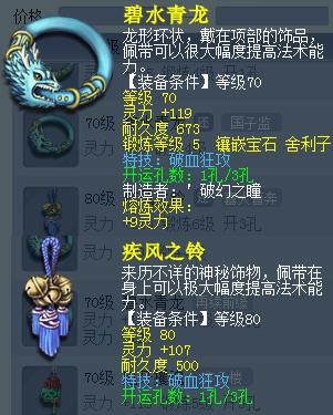 而饰物,比较建议选择80级暴属性的特技破血狂攻。当然了,70级的也可以。如果选择的是70级的饰物的话,最好选择是玩家打造的。这样,初始灵力跟80级的相比并不会逊色太多。