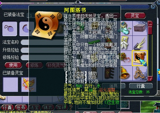 推荐理由:封系最大的优势就是速度,在PK中失去速度是非常危险的,所以凌波城仙符安排上,当确保自己速度优势不受威胁的时候,可以将其替换成蟠龙玉璧增加生存能力,而河图洛书是每个封系必带法宝,增加封印命中率。