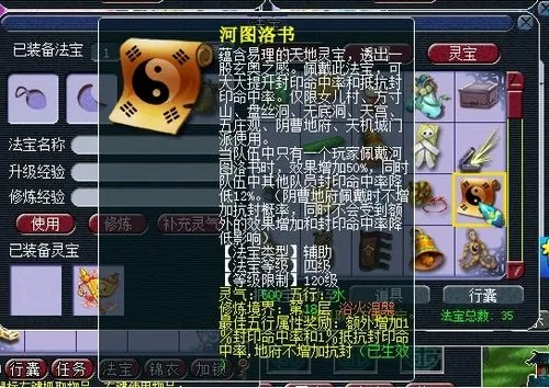 推荐理由:女儿村作为封系的优势之一就是速度,失去速度的女儿村在PK中非常危险,因此凌波城仙符是不错的选择。如果对手没有女儿村,就可以通过增加自身生存能力,替换凌波仙符为蟠龙玉璧。河图洛书每个封系都带,其作用是增加封印命中率。