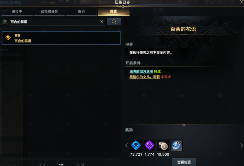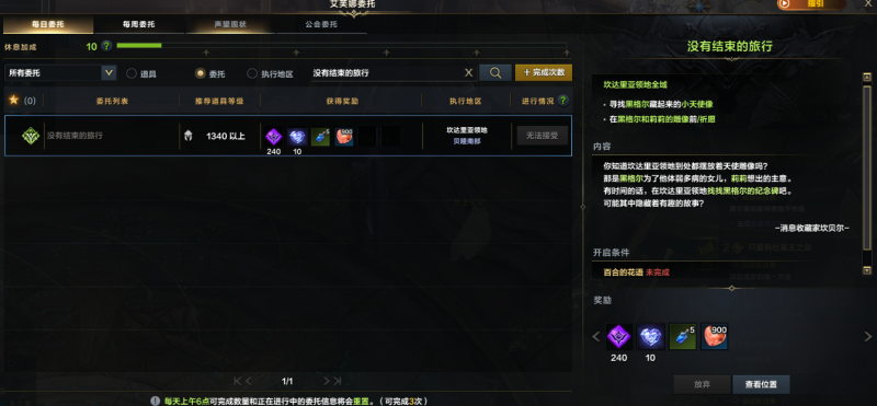 任务开启的条件需要我们完成百合的花语,百合的花语任务前置在坎达里亚领地地图上完成,完成后就可以接取日常委托没有结束的旅行了