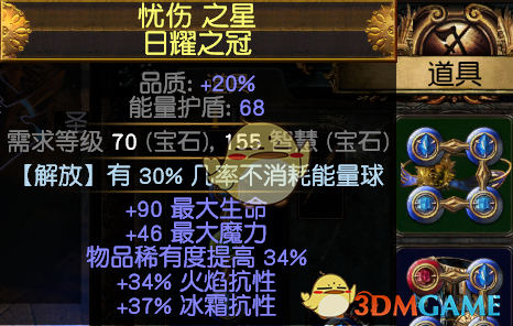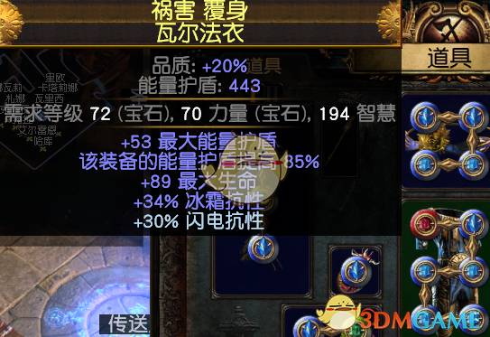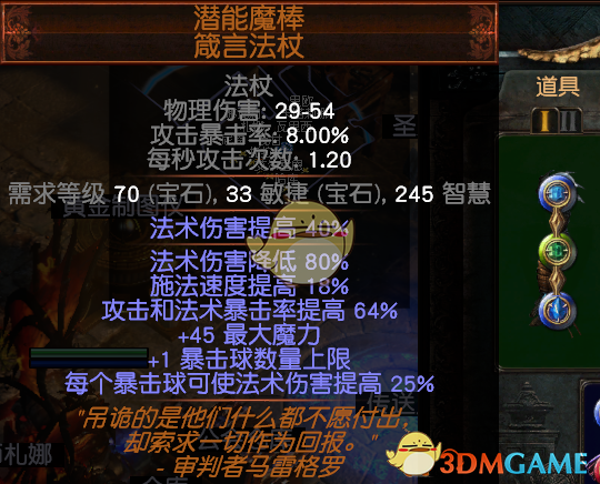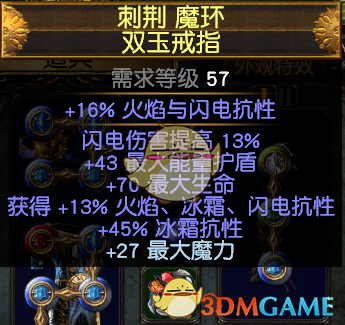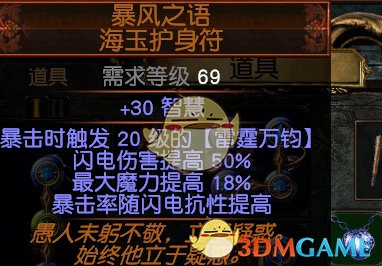 3.首饰:项链:黄装找生命,抗性,电伤,法伤,暴击爆伤,越多越好了,没有也无所谓,有血抗即可,用敏捷底子的最好。暗金推荐:电裂隙的项链,升级版:风暴之语。我自己打小裂隙怪掉了一个,就随手带上了,感觉不错,如果有的话可以带,没有无所谓,感觉熟悉也挺契合电弧的。但是不能触发上面的雷霆万钧。还有新出的暗金黑曜石项链,不知道好不好用。