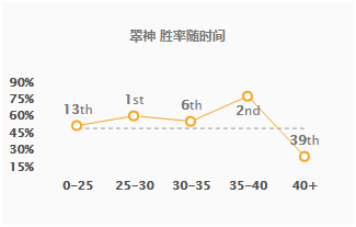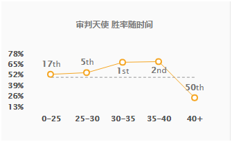 不过我们可以看到,天使的高胜率是在25到40分钟之间,一旦过了40分钟,对手的前排抗性和血量达到顶峰,那么天使就很难打动人了,作为一个C位的天使如果哑火,那么胜率暴跌就不是什么奇怪的事情了。