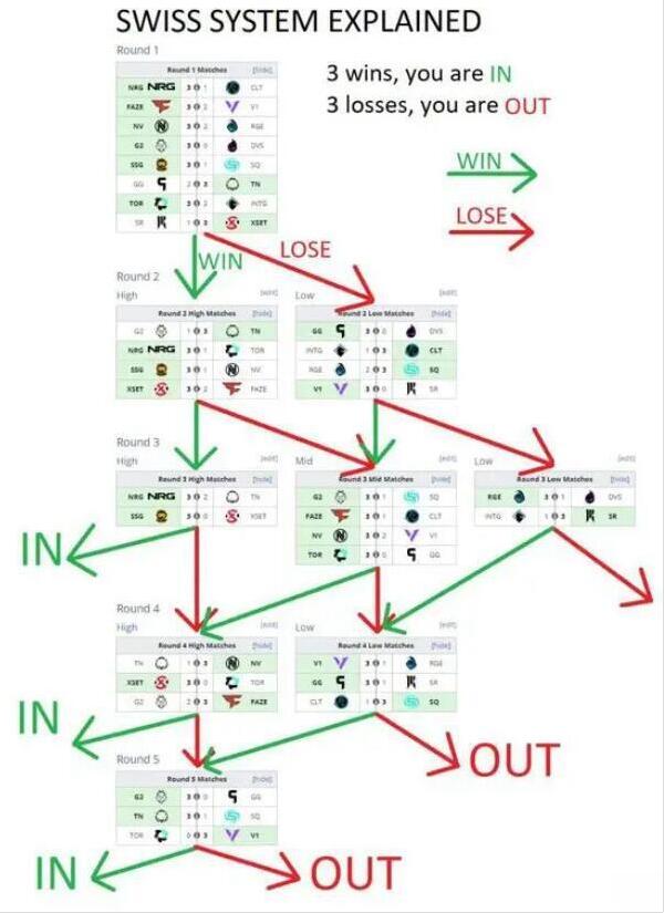 第三轮采取bo3的赛制,在第一轮和第二轮都获胜的四支队伍决出两个胜者晋级淘汰赛。
