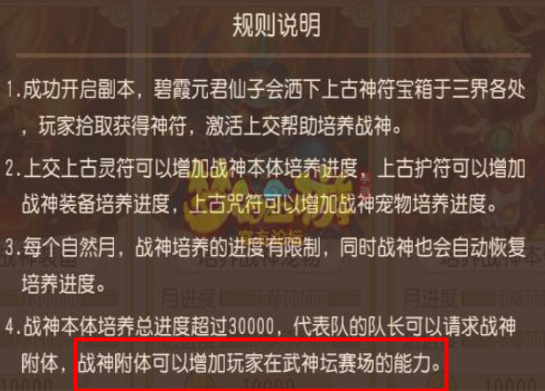 战神附体后会增加人物属性,请求战神附体需要组队且必须是队长带队,战神附体增加的属性只在武神坛比赛中才有效,活动时间为每月第三周周三9点到周四12点。