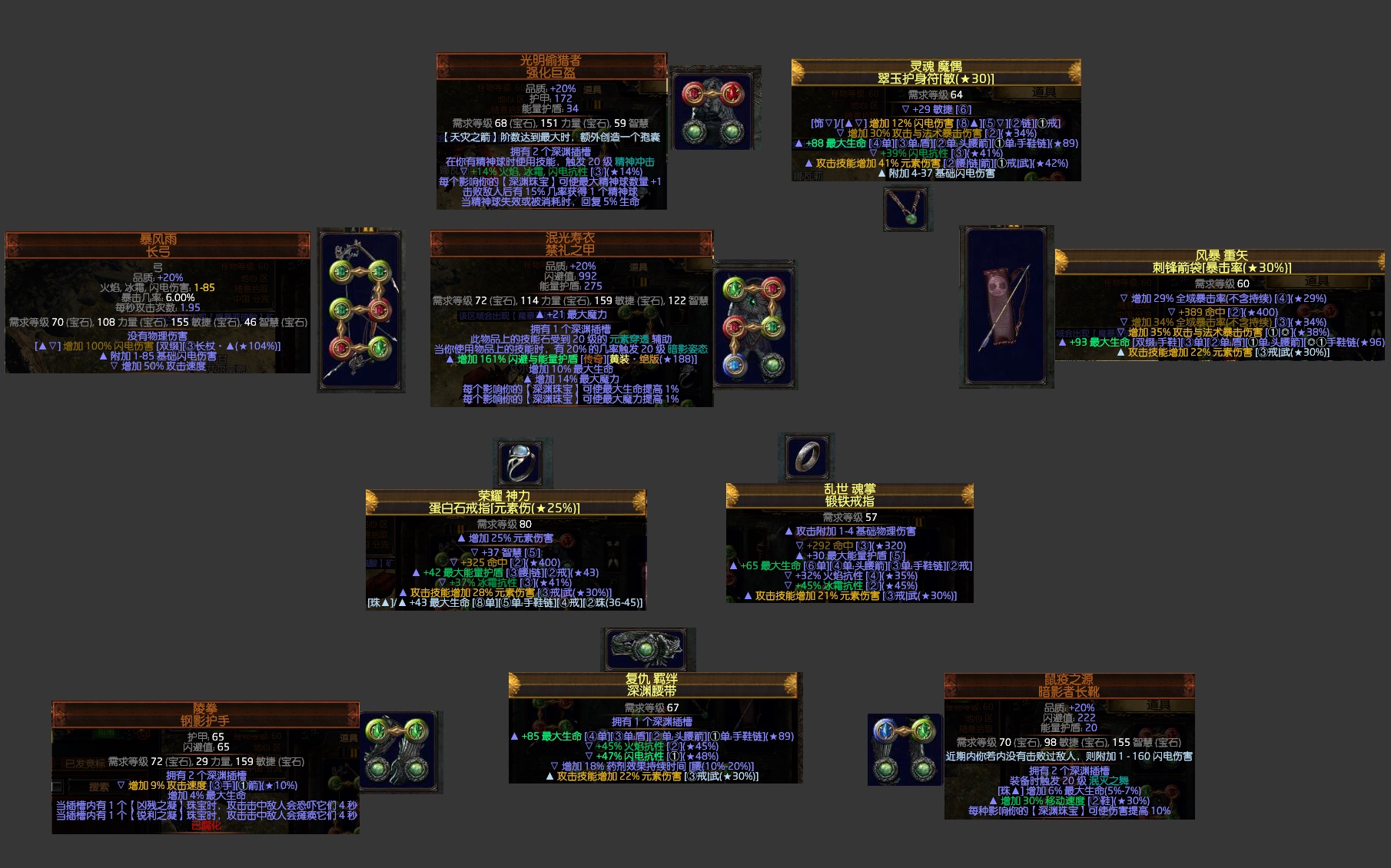 为了机体攻坚强度,我这里选择了深渊套。这套也没什么特别好说的,伤害足,血量足,过渡平滑,无需6L。深渊珠宝需要一定投入以及需要耐心去淘,或者自己洗。我一共使用了11个深渊珠宝,都是集市50c-1e一颗的价位淘的,事实上30c-50c一颗价位的珠宝足以打T18。