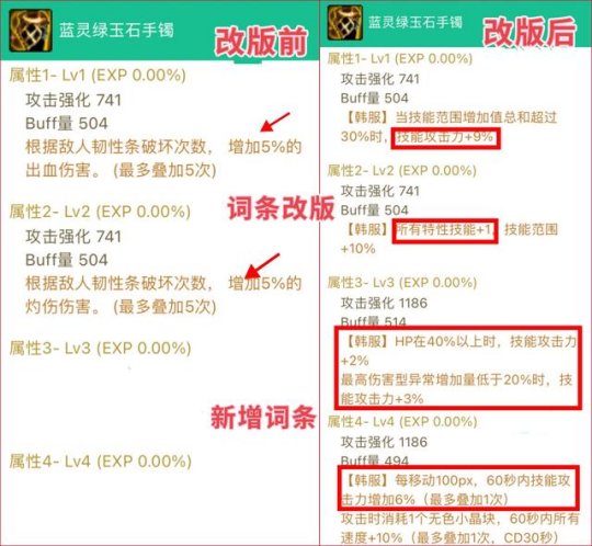 其次,神界手镯新增2个专属词条,“直伤5技攻”和“移动6技攻”,从而构架出【范围9技攻、TP+1、直伤5技攻、移动6技攻】的完美组合,但是,现版本只能准备2个改版词条胚子,无法完美。