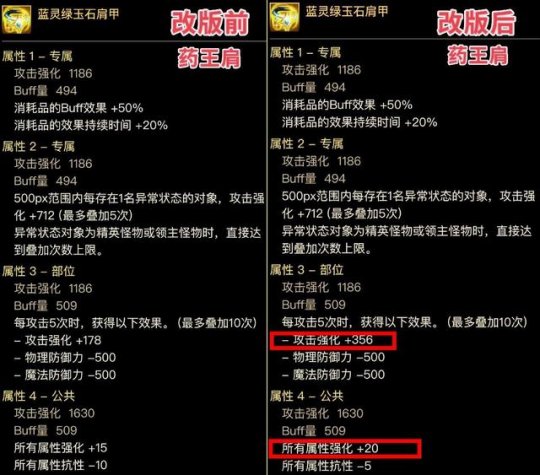 神界改版后,“药王肩”毕业词条,淘汰了“单15”,启用了“小攻强”,组成【消耗品buff、领主攻强、全15、小攻强】的究极毕业词条。