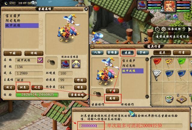 2. 拿角色经验喂养坐骑(坐骑快速升级法,单次消耗最多2000W,另外)
