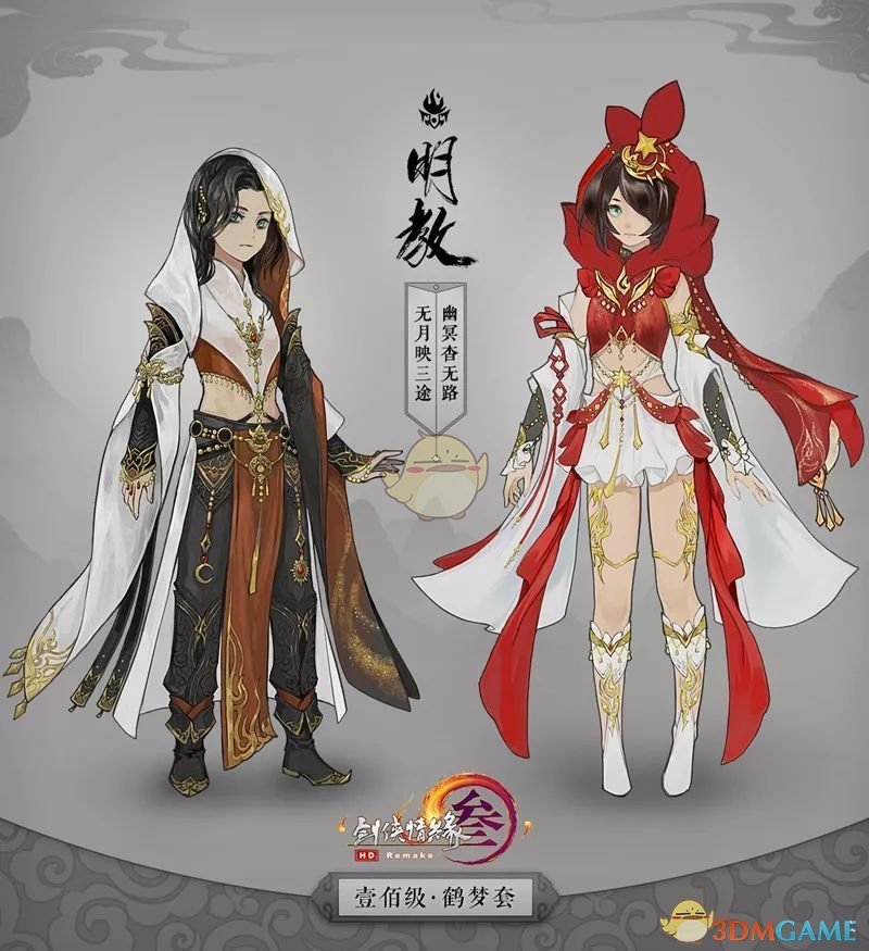 明教“鹤梦”套,以日月为设计主导,在色彩上选用了黑白、红白两款双色搭配。款式修身,用料轻盈,适于西域生活。随身兜帽隐匿容颜,添加诸多门派特色装饰进行点缀,精致而不失格调,使得服装整体更能彰显别具一格的神秘感。