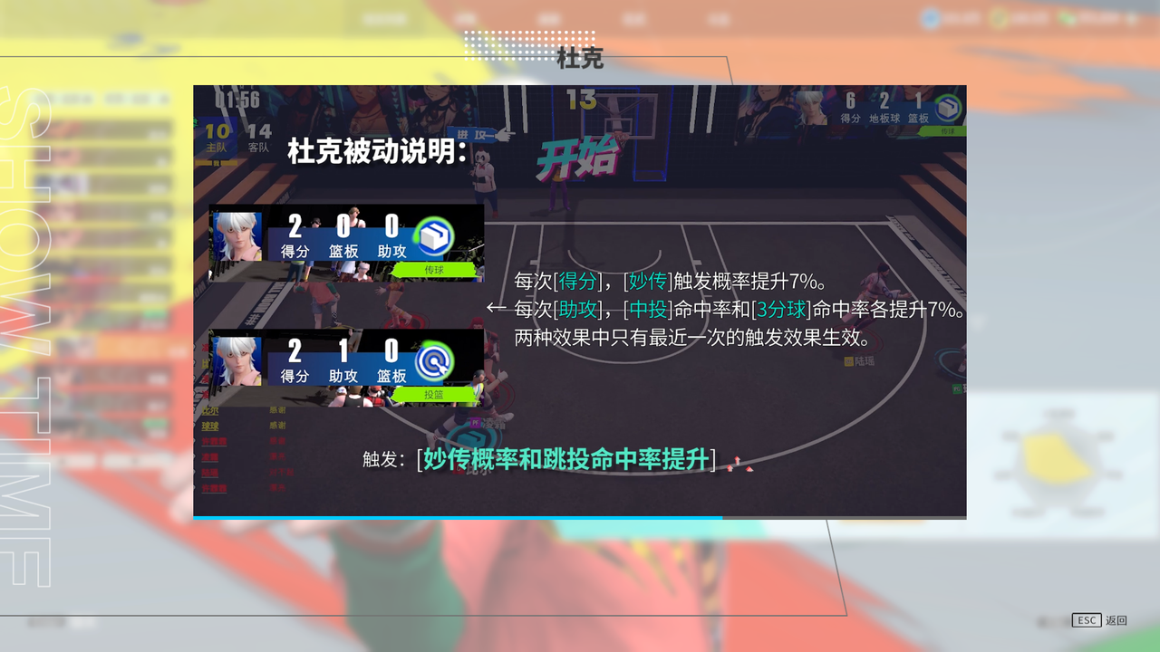 【双面公爵】:每次得分,[妙传]触发概率提升 7%,每次助攻,[中投]命中率和[3分球]命中率各提升 7%。