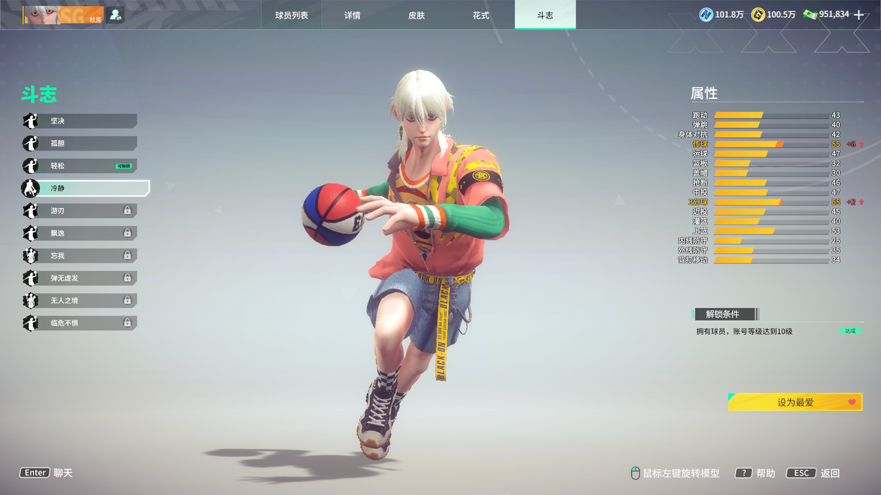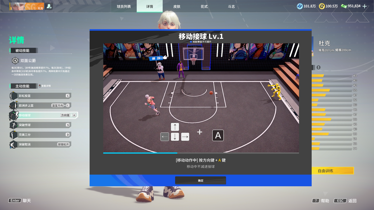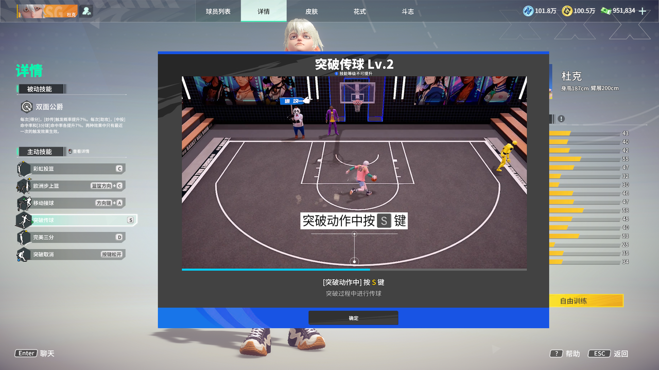 斗志推荐【冷静】增加传球属性六点,三分球属性两点,当杜克在对局中注重防守时,更多的可以偏向控球后卫的打法,通过传球和跑动给对手球员施加压力。