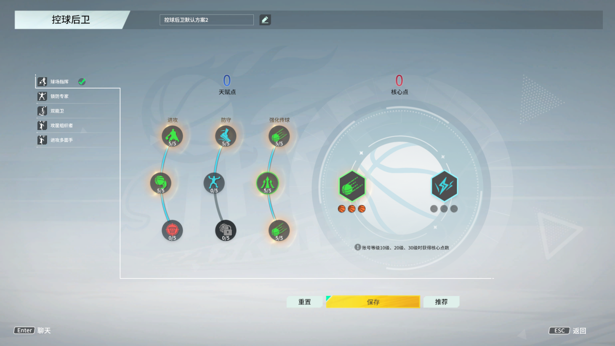 天赋专精【球场指挥】核心点推荐【十美分】,主加点【妙传专家】【迅捷反应】【传球大师】