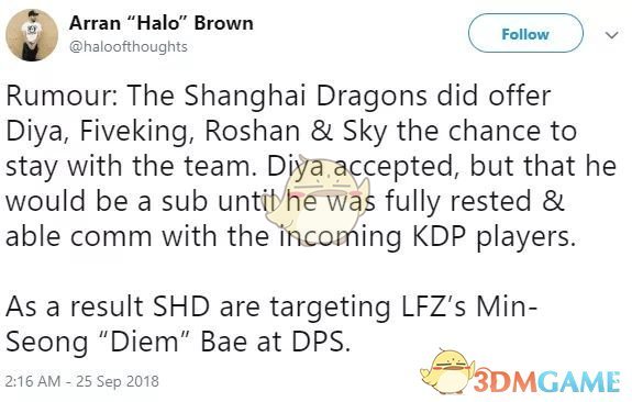 2018年9月25日,有流言爆料龙之队正在追求输出选手Diem。