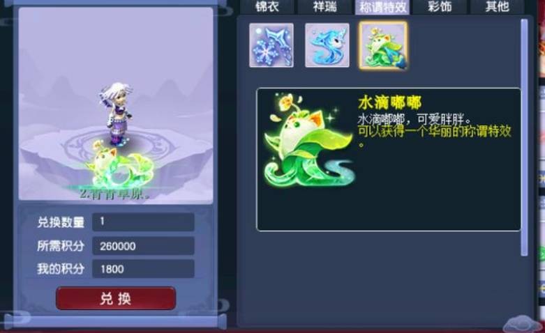 1、在游戏中,仙玉积分可以用于兑换“水滴嘟嘟”称谓特效,这个特效所需要的积分为26w。跟水嘟嘟相匹配的,还有草玉露队标,跟水滴嘟嘟一样,整体呈现绿色。