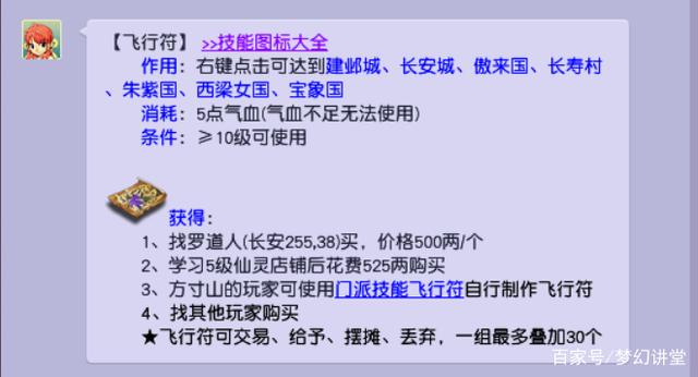 飞行符的制作门槛极低,技能超过30级就能制作,每次只消耗50魔法和少许活力。30级最高消耗6点活力,80级小号最低2点活力。