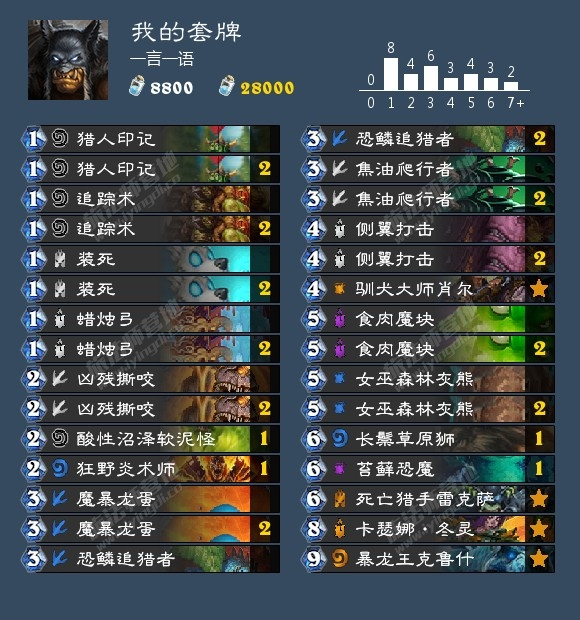 说到炉石传说中猎人的卡组,以前都是平民的最爱,但现在很多猎人的卡组也都需要橙卡支持了,招募亡语猎当中的橙卡不少,强度也很高,只是对阵快攻卡组有点难打,但如果改进一下呢?我们来看下这套卡组吧。