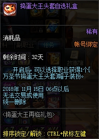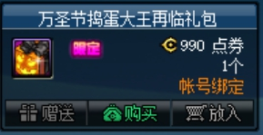 售价为 990 点券,可使用代币券购买,每购买两个礼包赠送一个捣蛋大王头套自选礼盒