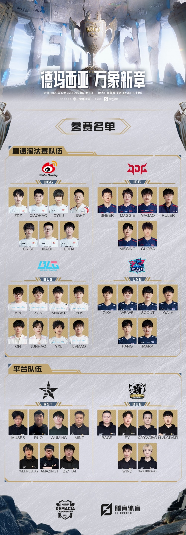 德玛西亚,万象新章!2023德玛西亚杯将于2023年12月25日-2024年1月6日举行,参加2023全球总决赛的4支LPL队伍,WBG、JDG、BLG、LNG将直通淘汰赛阶段,还有2支平台队伍会在小组赛中登场。