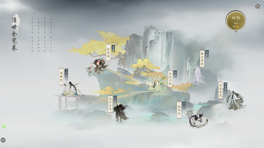 在浮世全览卷中可以找到【鸿雁行】【百景游】【闲涉丹青】【集纳万物】【踏云寻芳】【趣闻志】【众生百态】的解锁进程,也可以从以上玩法中获得雅探点,解锁探索等级并领取对应奖励
