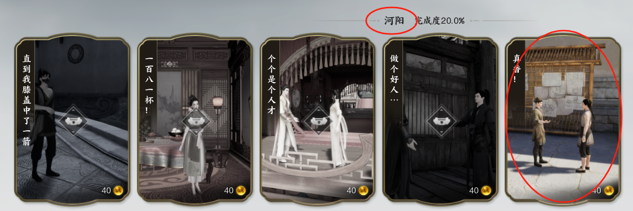 4.趣闻志:这个玩法比较随缘(超难)。以我解锁的这个为例,给的提示就是地点在河阳,两个人在一个告示牌旁边谈话。当你靠近的时候,能够看到他们脚下有蓝色光晕提示,走过去听完他们的谈话就能解锁了。
