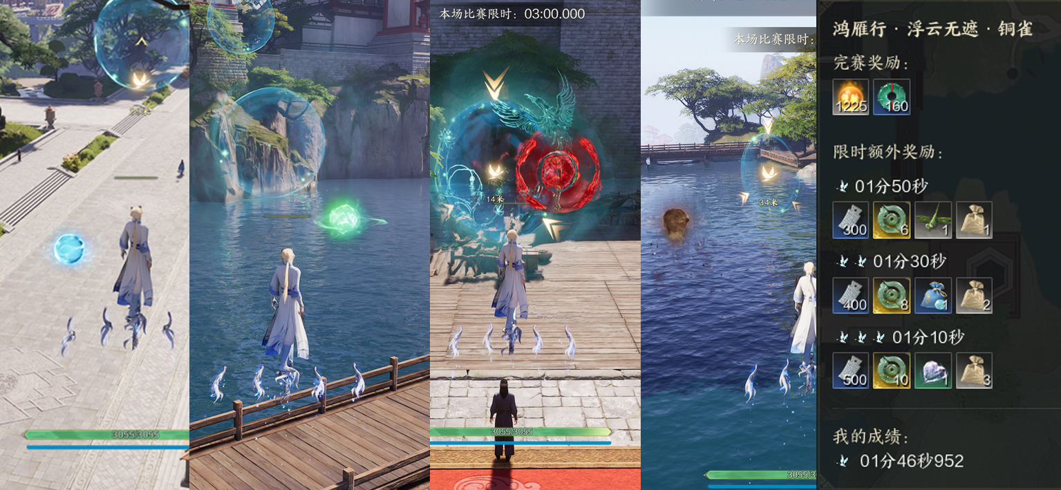 7.鸿雁行:这个玩法在地图上是仙鹤图标,追踪过去就行。它就像考科目二,需要有一定的飞剑驾驶熟练度。下面我来教你们理论,仙友们自己实践。交互仙鹤,上飞剑准备,倒计时结束,跟随指引穿过一个又一个的光圈,在规定时间内到达终点即可。它还有一个竞速奖励,如果想玩竞速,就要了解交通规则了。仙友请记好,蓝球加速,绿球回气力值,红球减速减气力,黄球减速挡视野。道路千万条,只碰蓝绿球,碰了红黄球,仙友两行泪。