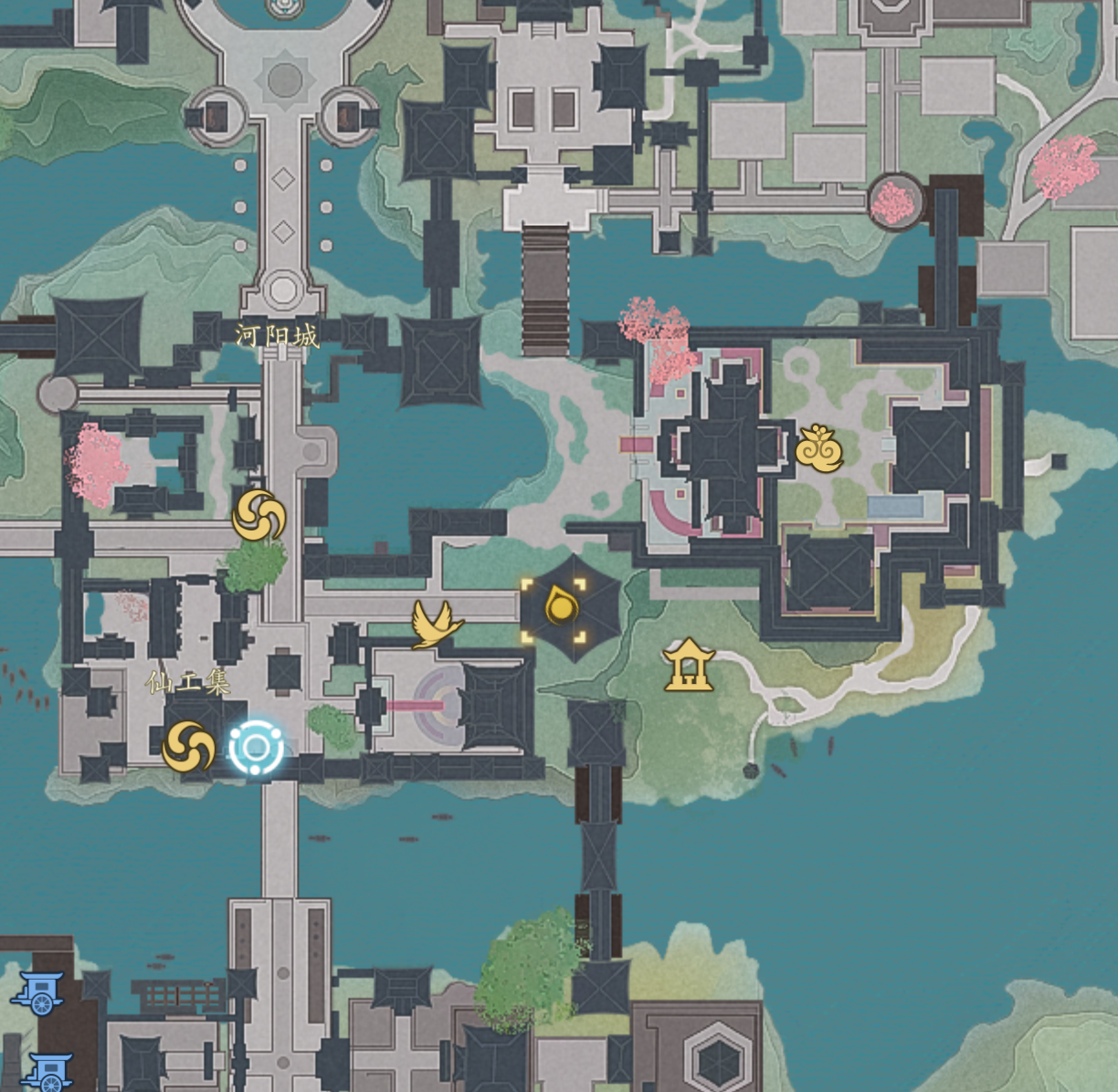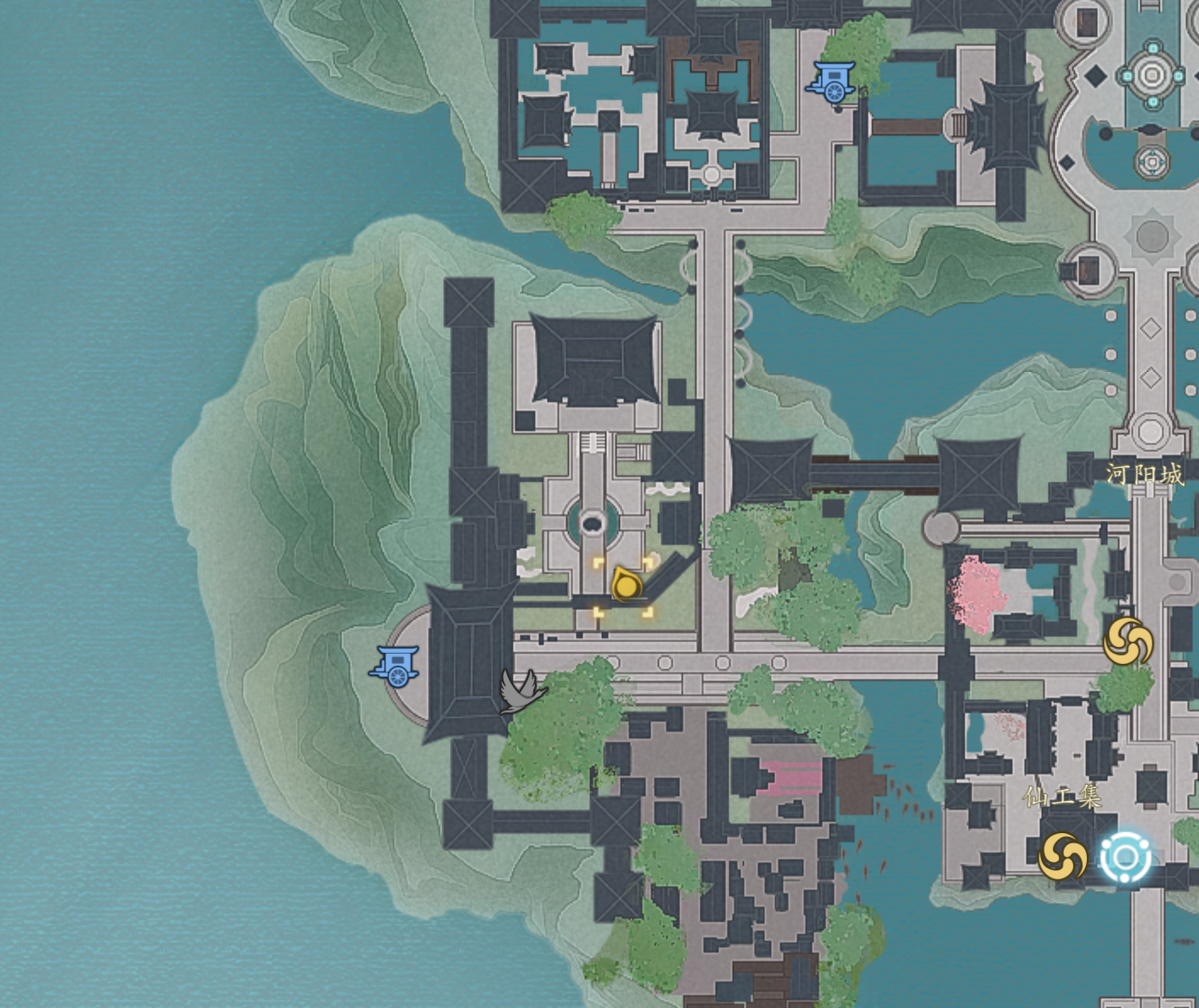 比较不好找的是第七张图,在河阳左下,摘星楼正下方,从河阳城左边马车NPC传送过去