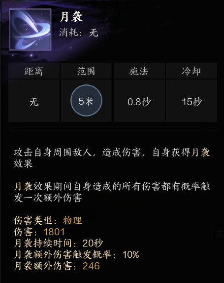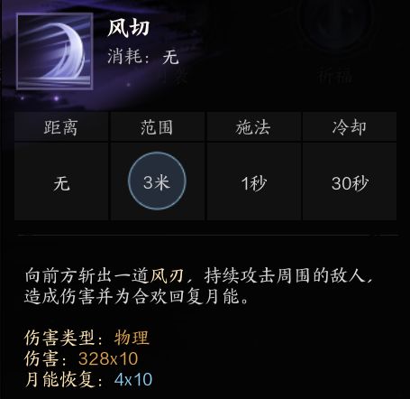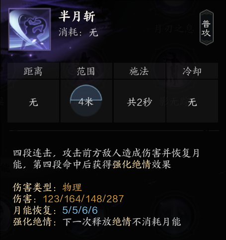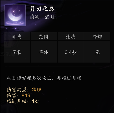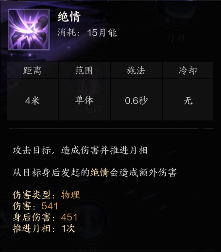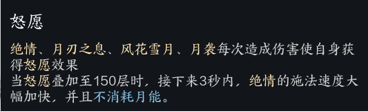 看完技能我们已经有了一个大概的了解,这套主要的输出来源于绝情(右键)和月刃之息,通过绝情来推进月相,用普攻和风切回复月能,满月后施放月刃之息。因为绝情从背后攻击有额外伤害,所以我们尽量打背。通过绝情、月刃之息、风花雪月、月袭来叠怒愿buff,达到150层后快速施放绝情造成伤害并推进月相,期间满月后施放月刃之息,不造成月相溢出,需要注意的是祈福前保证高月能高月相,怒愿之前压低月能以免造成溢出。