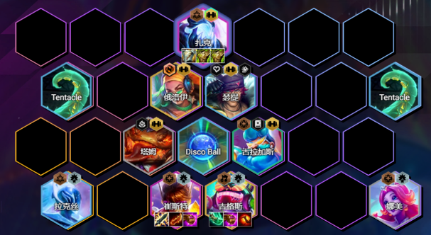 1、阵容组成:塔姆、酒桶、瑟提、娜美、拉克丝、扎克、卡牌、吉格斯、俄洛伊