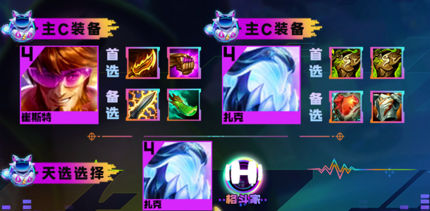 阵容思路:这是一套以4、5费为核心的运营阵容,前期尽可能走连胜运营为主,这里小嗨主要推荐是以格斗+迪斯科+耀光这三个羁绊过渡为核心。