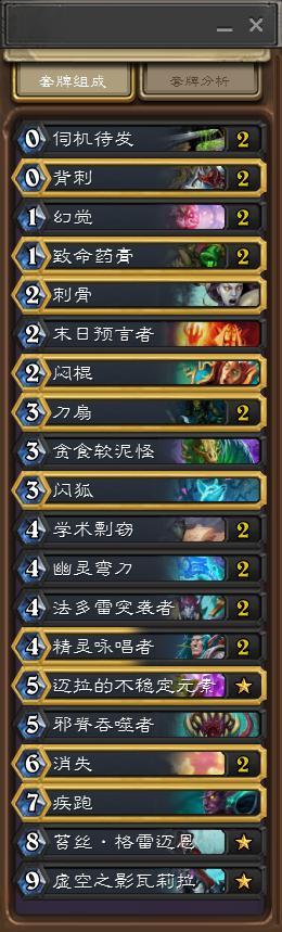 2.面对控制卡组:起手也是找432,找刀,一定要把吃刀骗出来以后再涂毒药,不稳定元素之前尽量把双学术剽窃、双法多雷和DK攥在手里,看好时机直接撕牌库然后投资英俊和剽窃给对面压力,如果偷到DK的话记着把消失,DZdk都扔了在扔苔丝,你会发现原来我们也可以无限。