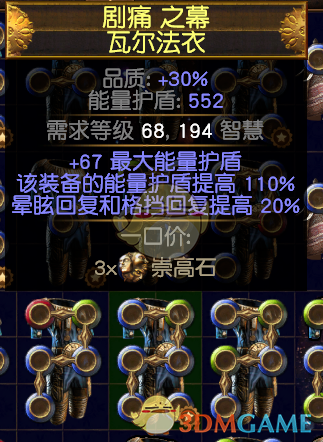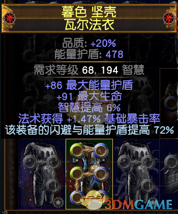 瓦尔法衣就不用说了,穿上这种衣服,轻而易举的突破1W+ES,而且这个赛季的ES衣服特别容易做一发致密化石就能搞定,比上面的烈焰之心总体护盾能多个20%多,所以在防御上面,2件衣服完全没有差距