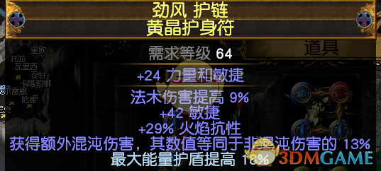 项链的:需要找力量+敏捷底子的黄晶项链,洗出附加额外混沌伤害就行了,最好是留一个前缀出来,大师可以上20%的能量护盾